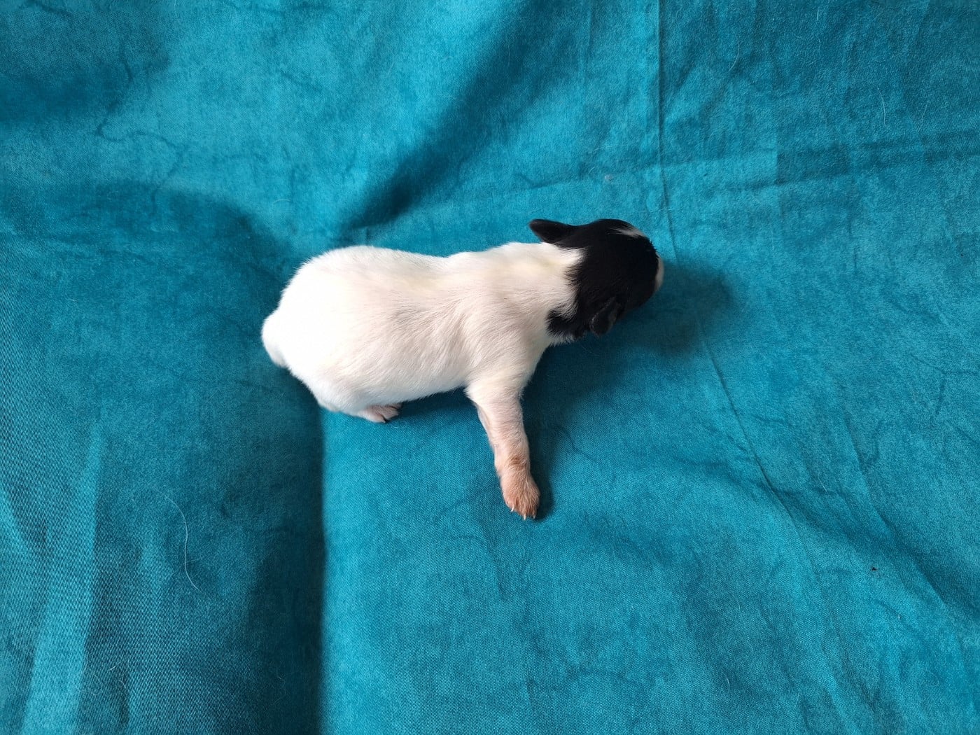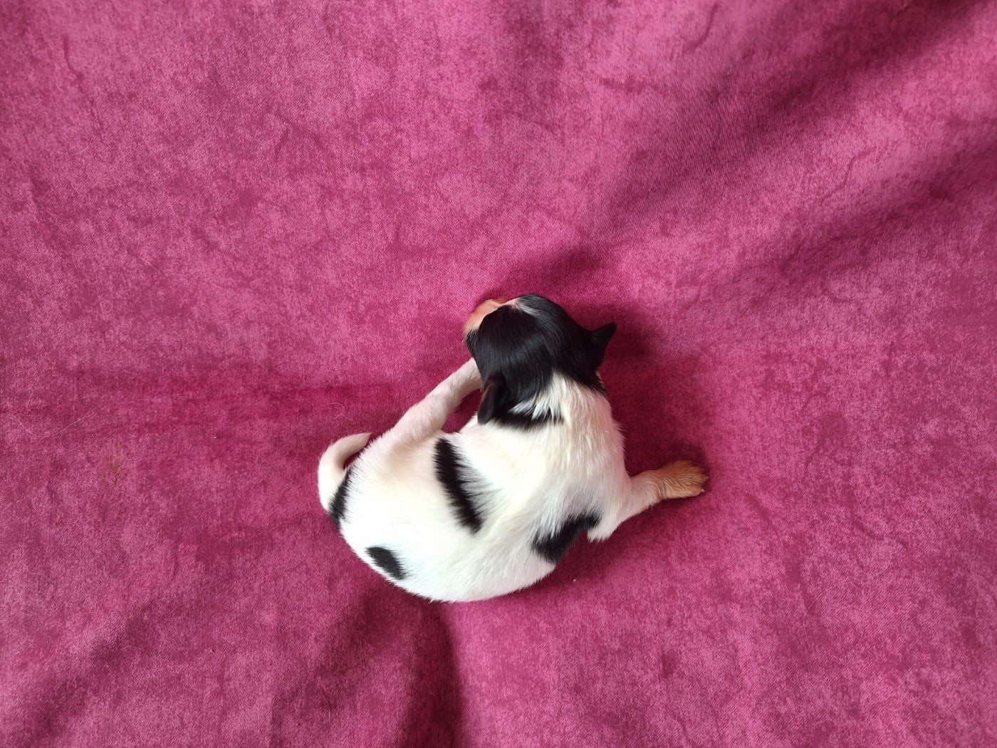 Une jolie fifille tricolore comme ses parents avec de belles taches noires sur le corps. On laisse grandir, mais elle pourrait rester a l'élevage étant donné que c'est la dernière portée de sa mère.